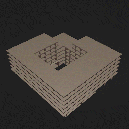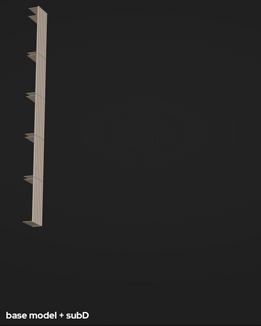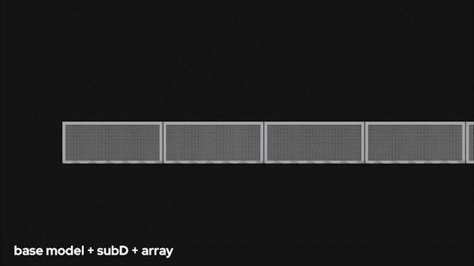 Najbardziej zaawansowanymi obiektami i kluczowym elementem występującym w modelu budynku są jego przykrycia elewacji falowaną i perforowaną blachą. Została oparta o mesh o przekroju parabolicznym, który we frontowym widoku został przedzielony co jakiś czas dylatacją pionową oraz poziomą, aby stwarzać wrażenie paneli. Dołożyłem również prostopadłe, wewnętrzne elementy, trzymające elewację do konstrukcji obiektu.