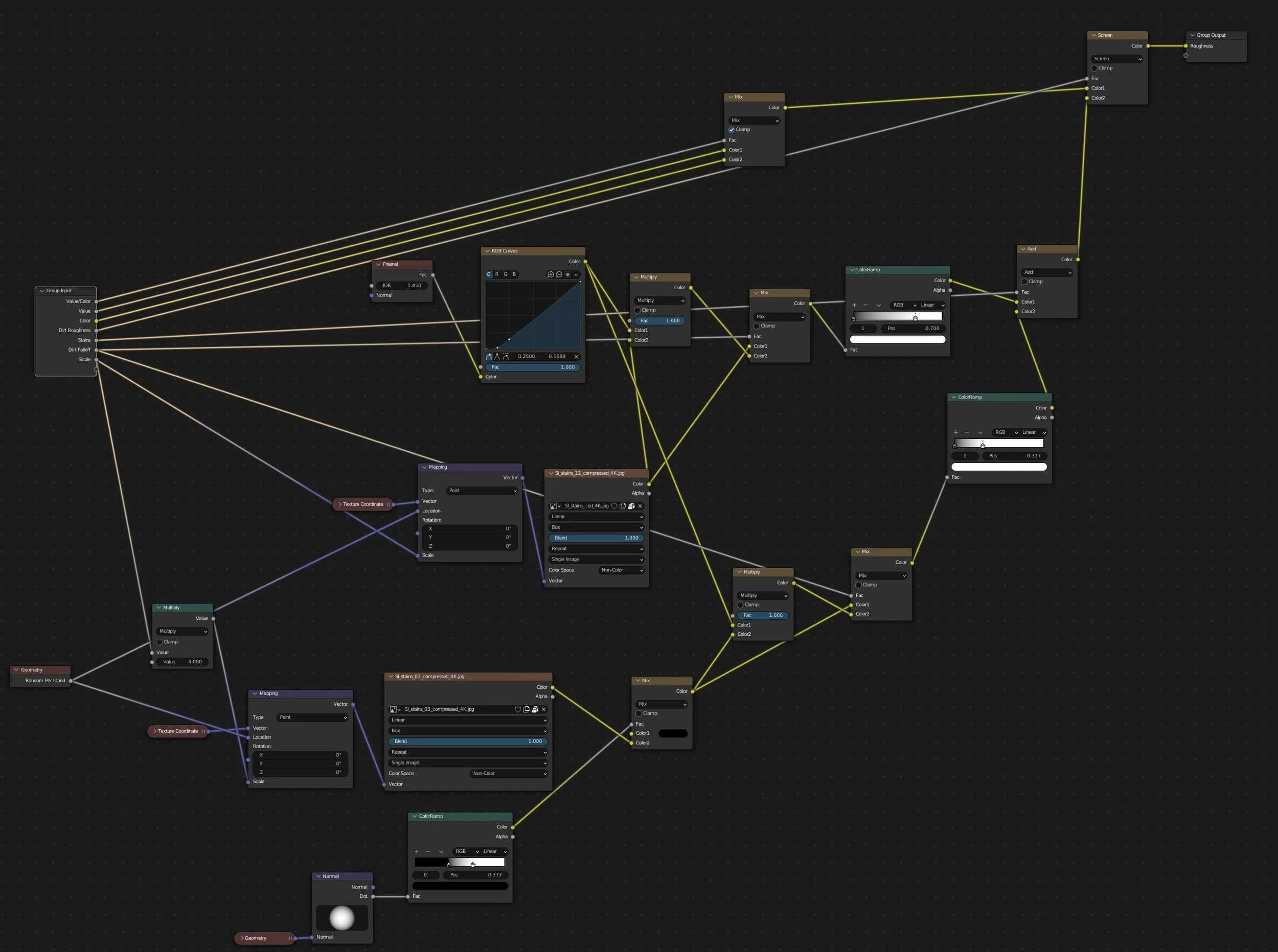 Do każdego materiału, który generuje większe lub mniejsze refleksy, dodaję półproceduralną dirt mapę. Dodaje to realizmu każdemu materiałowi.