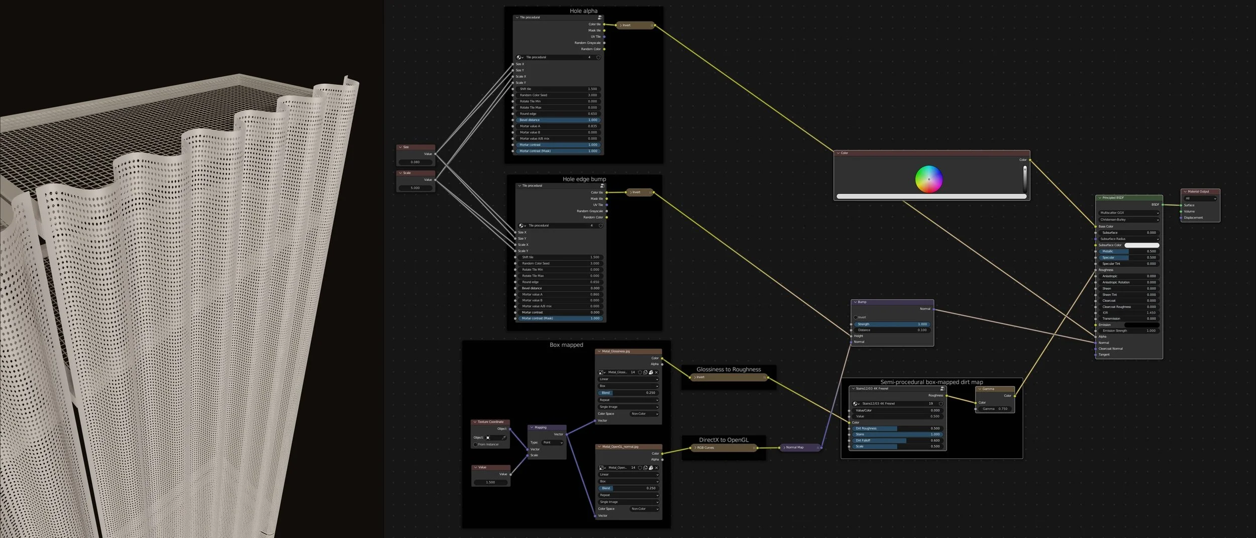 Bardziej zaawansowanym materiałem jest perforowana blacha elewacji. Oparłem go o proceduralnie generowane kafelki, z których wygenerowałem okrągłe otwory o regularnej siatce i połączyłem z socketem ALPHA. Bazowy zaś materiał blachy to prosta mapa GLOSSINESS oraz NORMAL, które ustawiłem BOX MAPPED – pozwala to nie tyle oszczędzić czasu na unwrapping każdego elementu z tym materiałem, jak też zachować tę samą skalę mapy pomiędzy różnymi obiektami. Odwróciłem obie mapy, aby wygenerować mapy ROUGHNESS oraz OPENGL NORMAL – odpowiedni dla silnika Cycles.