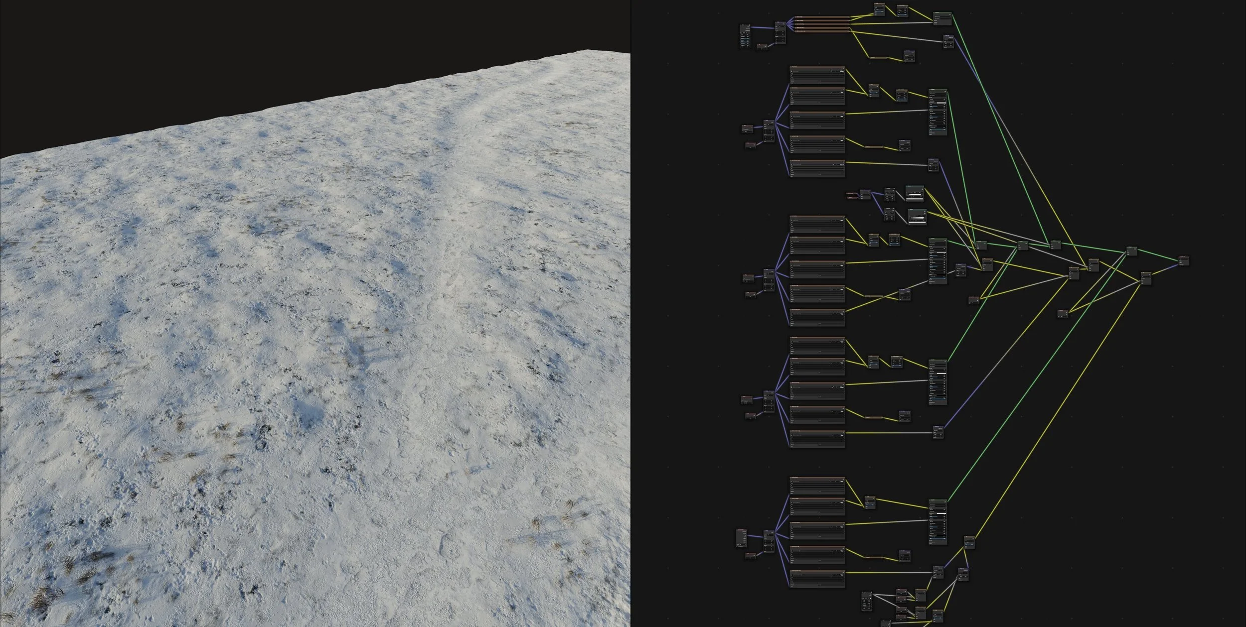 Oparłem go o cztery materiały pochodzące z megascans i przeplatanych ze sobą różnej skali MUSGRAVE NOISE. Dodatkowo dodałem do mesha VERTEX COLOR, odpowiadająca informacji, gdzie jest ścieżka i dołożyłem jeszcze materiał wydeptanego śniegu, którego oparłem na unwrapping.