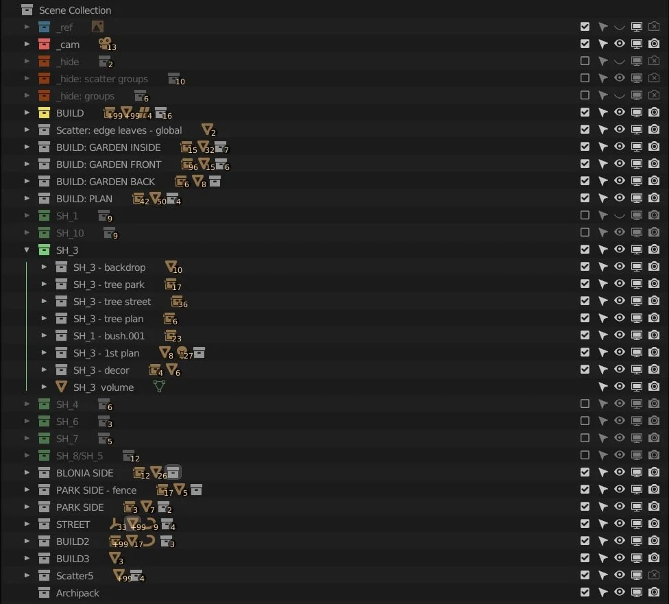 Zmiany te między kadrami muszą zachodzić automatycznie lub w szybki sposób. Toteż do każdego ujęcia przypisuję odrębną Collection w Outliner - jest to swego rodzaju warstwa, w której możemy zgrupować dane modele. Wyłączam bądź włączam w momencie, gdy pracuję, czy renderuję aktualne ujęcie. Zachowują one assety użyte w ujęciu, ale również odrębne Volume Cube, które odpowiadają za zamglenie ujęcia, którego siła zmienia się między ujęciami.