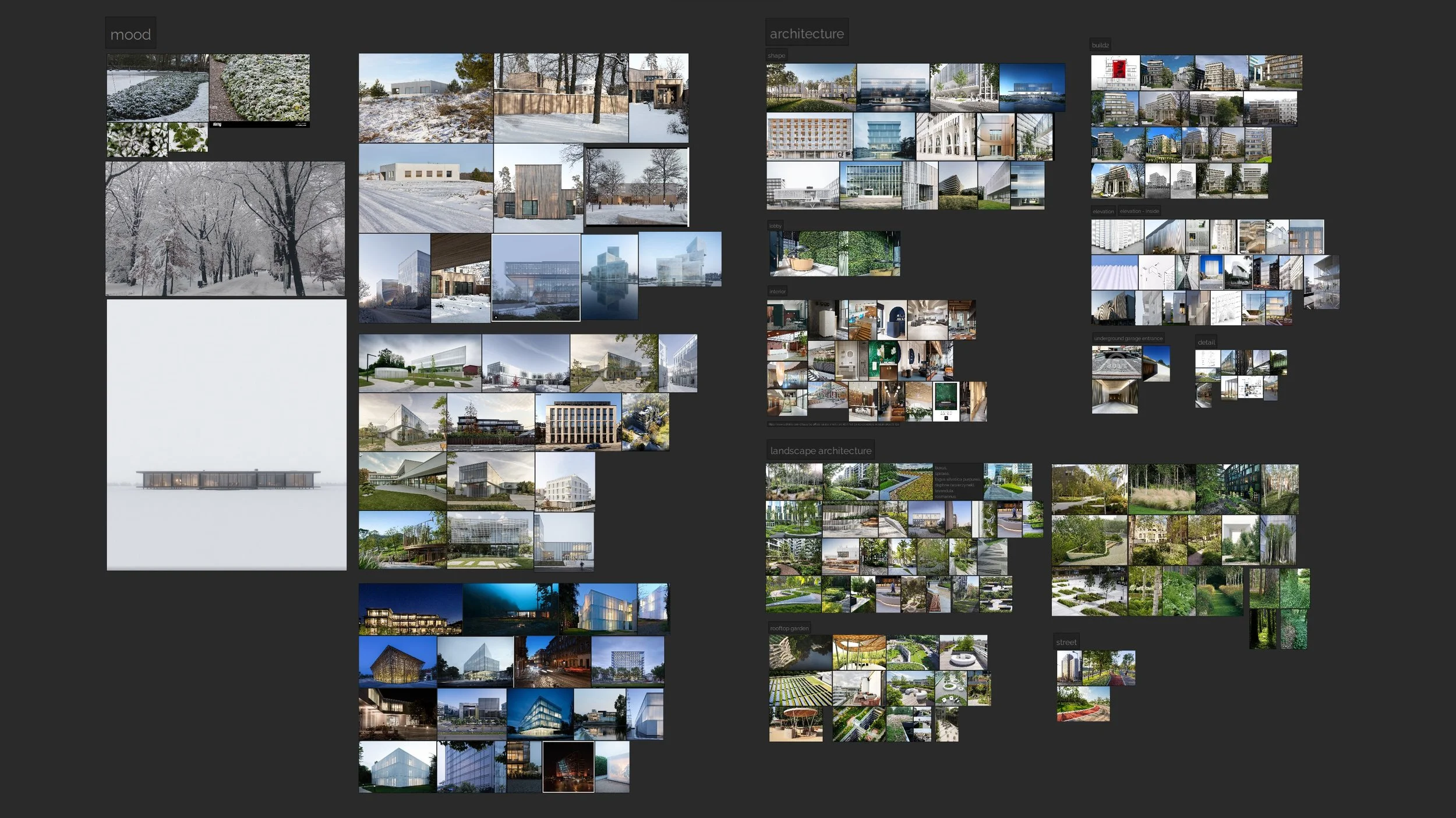 Budowanie otoczenia zaczynam od wyboru pierwszego ujęcia, które miałoby za zadanie przedstawić widzom kontekst wizualizowanej architektury. Często wraz z postępem prac ujęcie to, więcej lub mniej, zmienia swój kształt. W tym przypadku zmiany wprowadzały nieco więcej prac w jednym obszarze sceny, ale za to odejmowały w drugim.